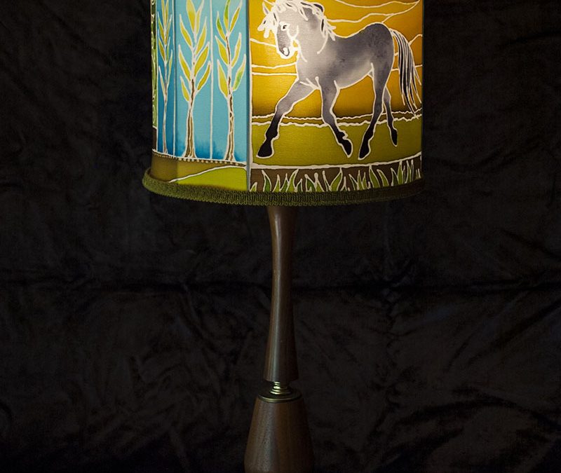 Dimension : 37x66cm Medium : soie 100%, teinture, monté sur abat-jour et pied de lampe vintage. Prix : $475,00 ©2020