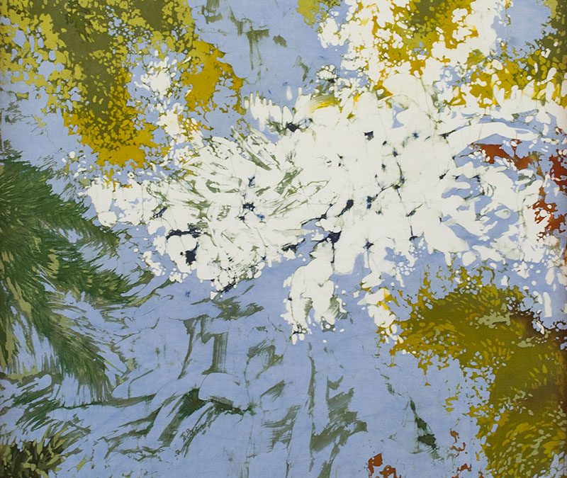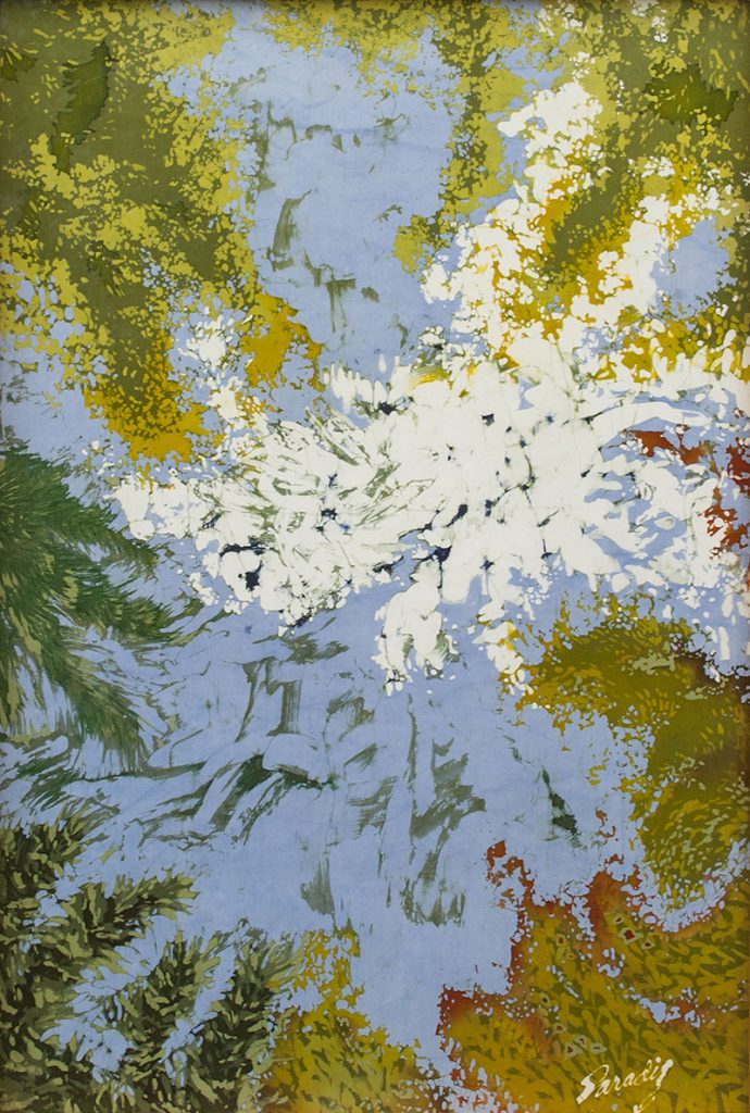 Dimension : 66.5x99 cmMedium : soie 100%, teinture, monté sur cadre de bois en érable massif (73x106 cm) et protégé d'une vitre certifié artglass ar 70%™. Prix : $2625,00 ©2018